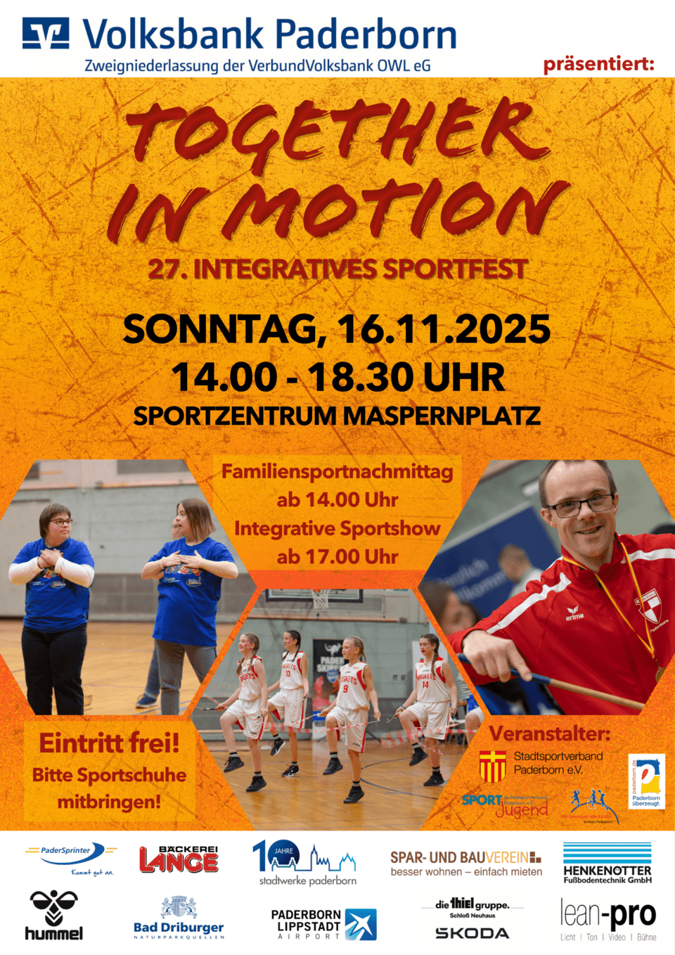 Im November eines jeden Jahres heißt es ab 14 Uhr im Sportzentrum Maspernplatz "Mitmachen und aktiv sein". Der Stadtsportverband Paderborn, die Sportjugend im SSV, der Paderborner Sportservice und der Verein Wir bewegen alle Kinder im Kreis Paderborn veranstalten ein integratives Sportfest mit Familiensportnachmittag. Zahlreiche Paderborner Sportvereine stellen ihre Sportarten als inklusives Mitmach-Angebot für Jung und Alt vor. Sportbekleidung und Sportschuhe sollten für diese Veranstaltung mitgebracht werden.