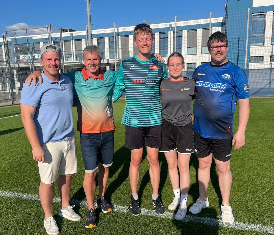 v. l. SCP-Trainer Lukas Kwasniok, SSV Vorstandsmitglied Matthias Brumby, TuRa Sportler Luca Davidhaimann, SSV FSJlerin Paula Boß und TuRa Sportler Christian Dinkel